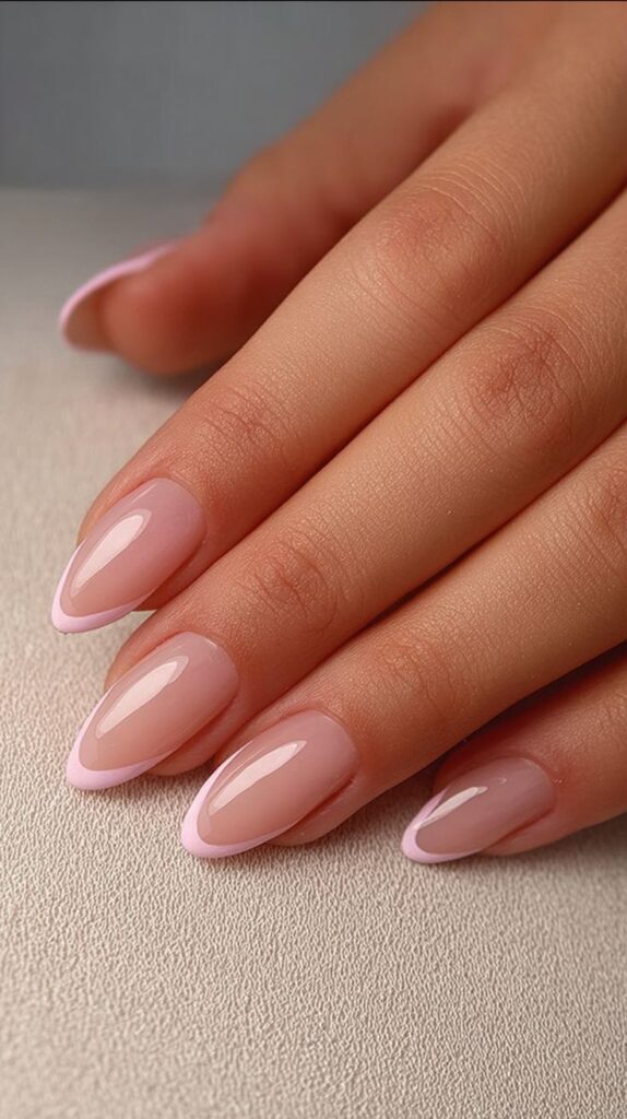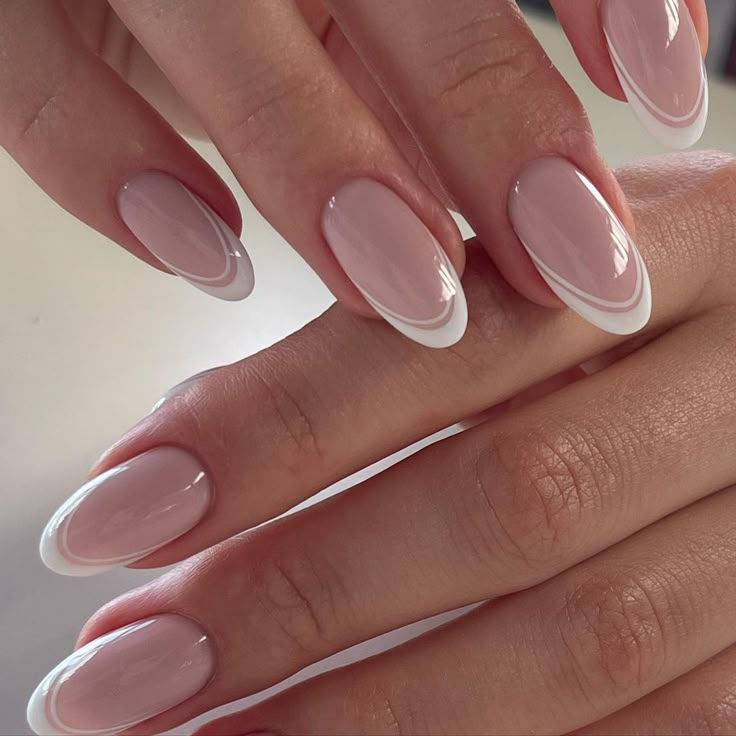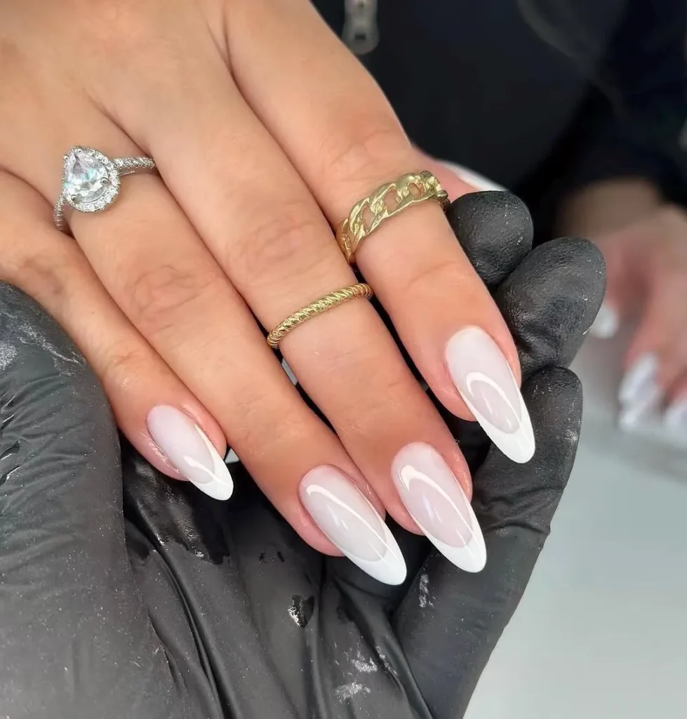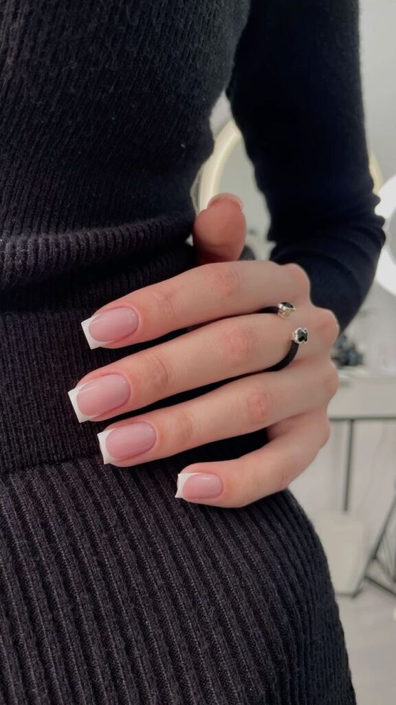 Micro-french blanche sur nude laiteux, ou french beige très douce. C’est élégant et parfait en photo.