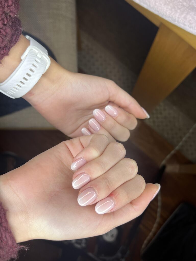 Micro-french fine (blanche ou beige). Plus c’est fin, plus l’ongle paraît long.